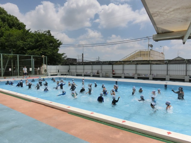 1年生が水泳の授業をしていました。1年生は八幡小学校の大きなプールに入るのは今年度が初めてでしたが、ルールを守って学習していました。アクアビクスがとっても楽しそうでした!