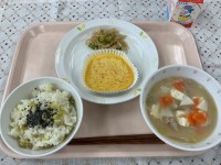 (献立)ゆかりごはん豚汁親子焼き茎わかめのきんぴら牛乳(メモ)料理名で「親子」と...