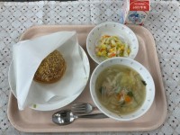 (献立)焼きカレーパンベーコンと野菜のスープコーンサラダ牛乳(メモ)カレーパンと...