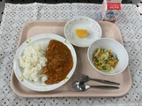 (献立)ハヤシライスフレンチサラダ果物(柿)牛乳(メモ)ハヤシライスは見た目がカ...