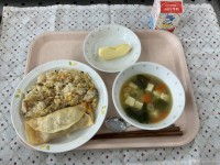 (献立)チャーハンわかめスープ棒ぎょうざくだもの(りんご)牛乳(メモ)給食の餃子...