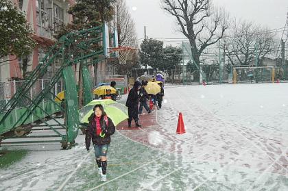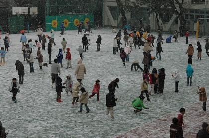 雪がつもった校庭。20分休み、校庭を遊びに開放しました。冷たい雪に負けず、子ども...