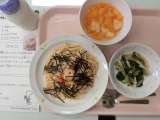 <献立> 和風スパゲッティ じゃこサラダ フルーツポンチ 牛乳 <食材> えび...