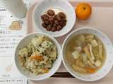 <献立> 磯おこわ 田舎汁 煮豆 冷凍みかん 牛乳 <食材> 鶏肉(岩手) に...