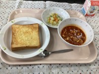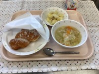(献立)あげパン野菜とチキンのスープジャーマンポテト牛乳(メモ)人気のあげパンで...
