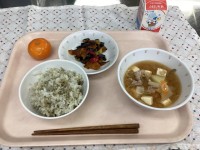 (献立)ごはんみそ汁(なす)鶏の七味焼ききんぴらごぼう牛乳(メモ)「きんぴら」は...