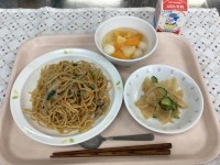 (献立)塩焼きそば野菜の中華漬けフルーツ白玉牛乳(メモ)ソース味の焼きそばが多い...