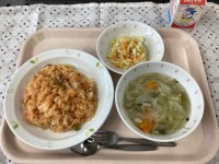 (献立)チキンライスベーコンと野菜のスープじゃがいものハニーサラダ牛乳(メモ)じ...