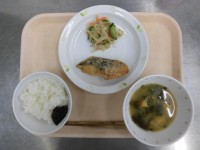 ごはん なめたけ さばの塩焼き 野菜の塩昆布あえ 卵と玉ねぎのみそ汁 牛乳
