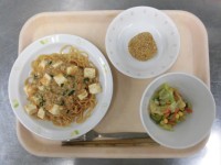 ごはん 韓国風ふりかけ チゲ豆腐 春雨サラダ みかん 牛乳