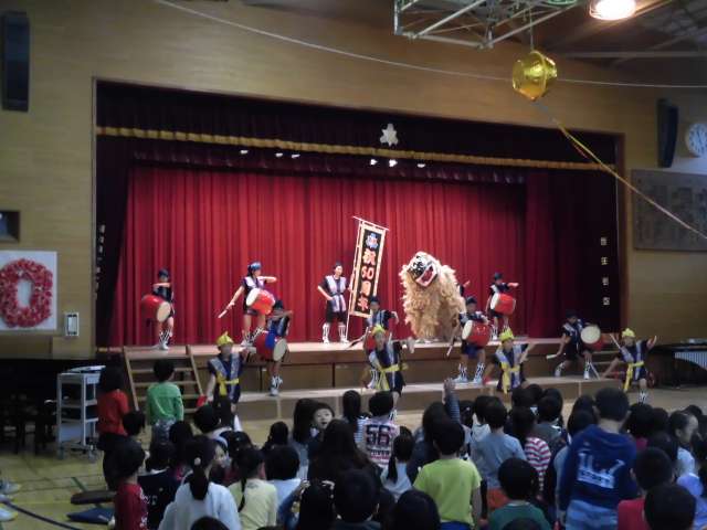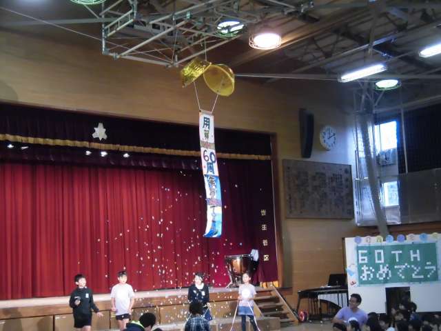 開校60周年記念集会では、運営・代表委員児童による用賀小の歴史の発表をはじめ、くす玉を割ったり、エイサーチームの演舞を見たりとみんなでお祝いをしました。