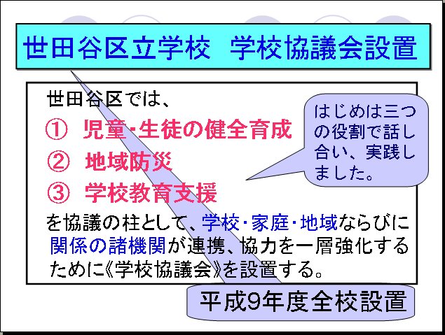 1.世田谷区では、平成9年度から区立小中学校96校に「学校協議会」を設置した。学校協議会では、「地域防災」「児童・生徒の健全育成」「学校教育支援」の3つを協議の柱とし、学校・家庭・地域ならびに関係機関の連携、協力を一層強化することを図った。