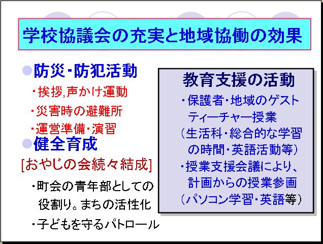 1.から4.までのプロセスが帰結した形として、保護者・地域が参画する学校運営体制が実現したことに大きな意義がある。教育支援の実質的活動が法的に整備され、公式な組織となったことにより保護者・地域の主体的な教育への意識が強まり、学校教育に対する期待感が膨らんだ。3者が共に学校改善に関り、共に教育をしようとする主体性は、学校全体を活性化している。
