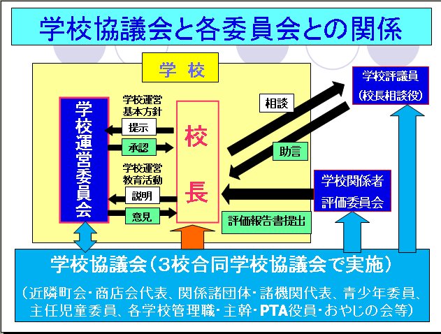 各支援委員会は、学校運営委員会に活動内容を報告したり、予算を要求したりすることができる。各支援委員会の代表者が学校運営委員会にオブザーバー参加することで、学校運営委員会の活動を理解し学校運営に参画する意識をもつことができるようになったことは学校にとって大きな成果といえます。