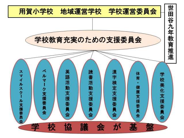 また、学校運営委員会を支える活動母体(町会・やぐらの会・YCC等)があります。