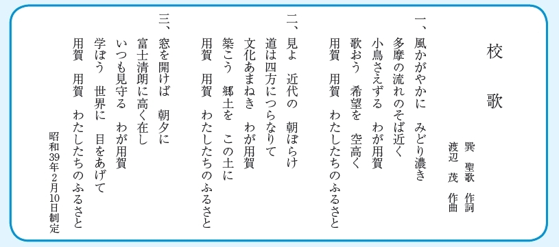 校歌は、永く心のふるさととしての価値を要求されますので、今の児童たちが、明るく楽しく歌えると同時に、何十年かの後になっておとなの歌としても、用賀小学校への強いきずなとなり得るようなものでなければならないと考え、旋律、リズム、調子等 いろいろと配慮いしました。ドレミで読み易いよう、笛、ハーモニカでも吹き易いよう、また伴奏も、少しピアノをやった人なら人なら出来るよう、そして全体の統一と変化と・・・・・。  幸い用賀の皆さまに、「たきび」の歌と同様に、愛唱されるならば、この上ないよろこびです。