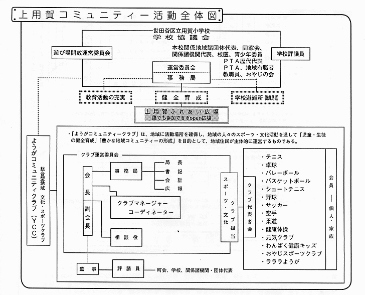 ・「よい子・よい町・よい学校」と考える学校長の方針と、「上用賀コミュニティ広場」を発展させ、地域の核となる総合型地域スポーツクラブ「ようがコミュニティクラブ」設立を願う地域の協働ですすめられ、平成16年3月28日の設立総会で発足した。