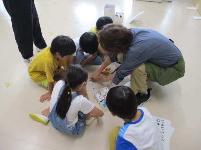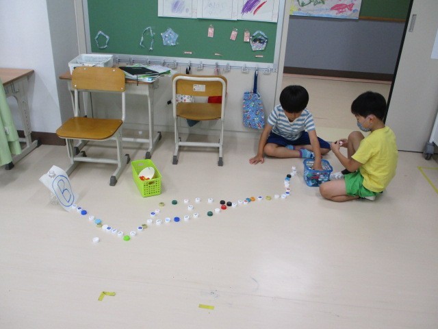 並べて並べて~わかたけ学級 公開日 2025/07/15 更新日 2025/07/15 今日のできごと わかたけ学級の低学年の図工の学習です。キャップやおはじきなどをスタート地点を決め、みんなで並べ、つなげて進んでいきました~