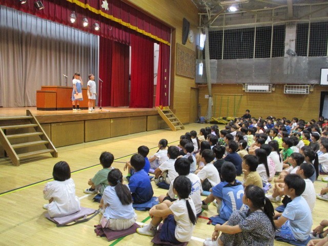 校長からは、一学期の最終日に、「自分が成長したこと」、「もっと伸ばしたいこと」について振り返り、夏休みは様々なことに自己チャレンジするよう話しました。3年生と、わかたけ学級代表児童が、1学期を振り返って言葉を述べ、みんなで校歌を歌いました~