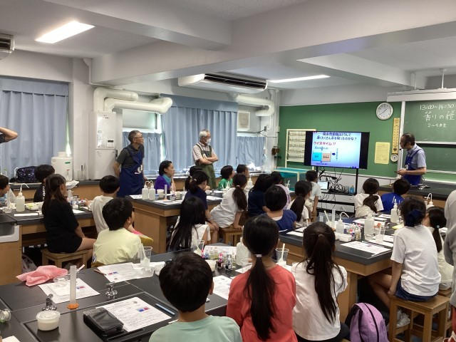 スマイルスクール 公開日 2025/07/30 更新日 2025/07/30 今日のできごと 「香りの粒を作ろう」ディレクトフォースの皆様による理科実験出前授業です。自分の好きな香料と色素で、良い香りを出す「芳香剤」を作ります。理科室の机上は科学者が今から仕事をするかのような雰囲気でした。「またやりたい!!」と歓声があがっていました。身近な物で学ぶことによって、科学が自分ごとになりますね。
