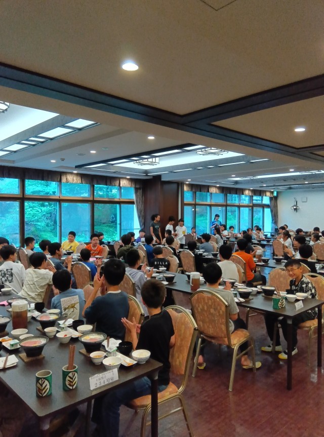 食堂に参集して、朝の会をし、朝食をとりました〜