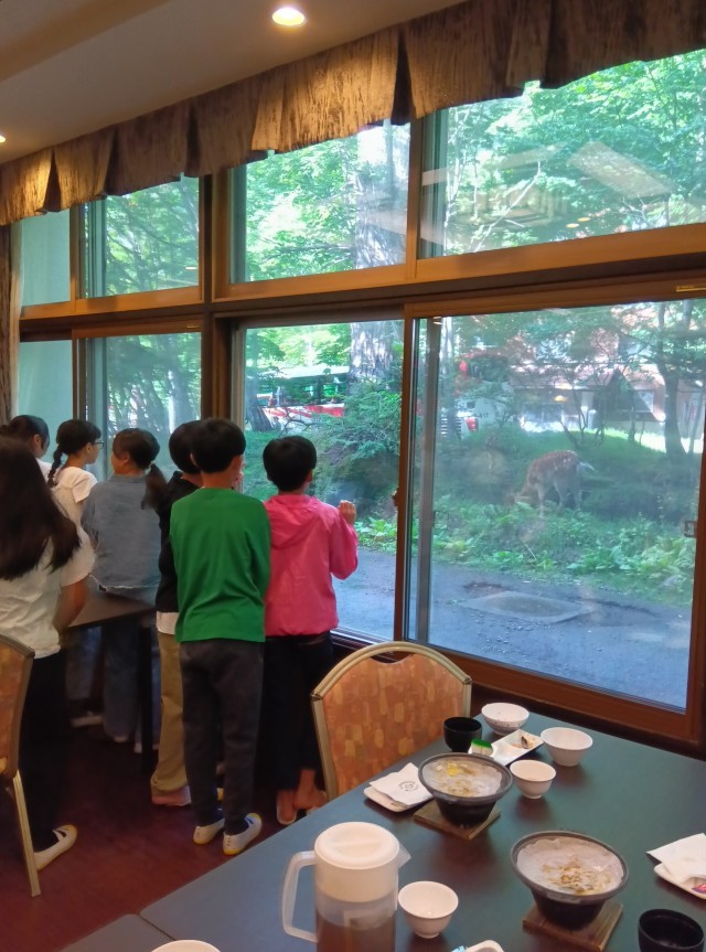 日光日記2日目〜珍客到来 公開日 2025/08/02 更新日 2025/08/02 今日のできごと 食堂の外に、しかがやってきました〜目の前に現れ、子どもたちも驚いていました〜昨日バス移動の際には、サルにも出会いました〜自然ならではの体験もしている子どもたちです〜