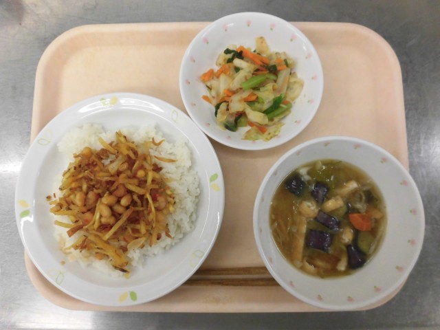 えびと大豆のバラ天丼 野菜のポン酢あえ 揚げなすのみそ汁 牛乳