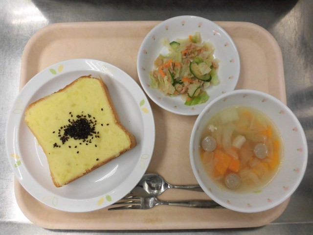 スイートポテトースト ツナサラダ ウィンナーと野菜のスープ 牛乳