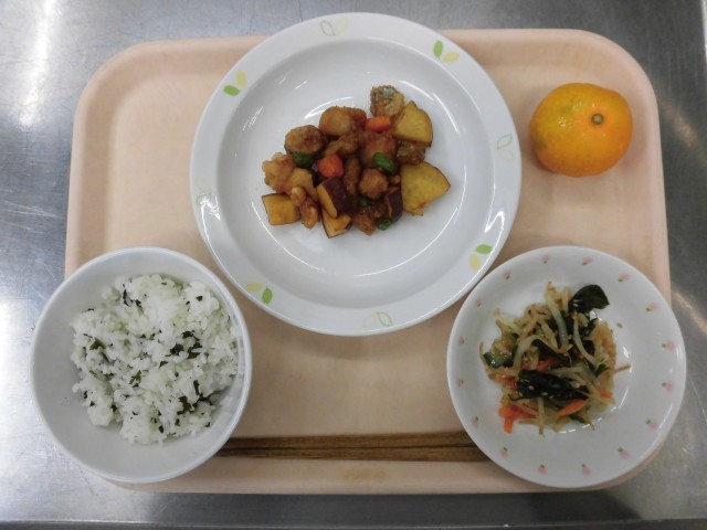 わかめごはん 五色あえ もやしときゅうりのごましょうゆ 冷凍みかん 牛乳