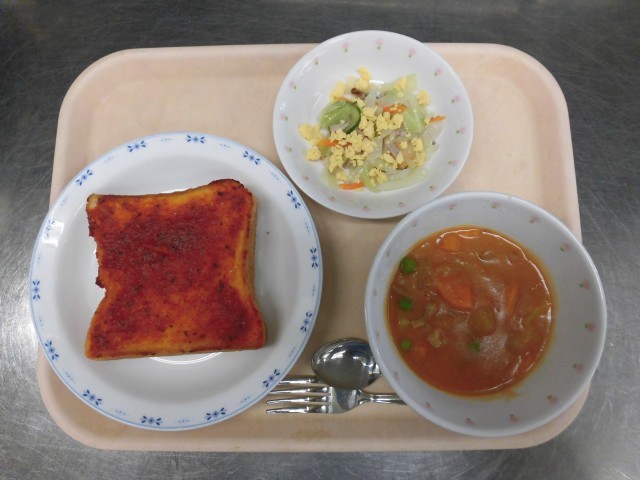 ブルスケッタ風トースト ブラウンシチュー ハムエッグサラダ 牛乳