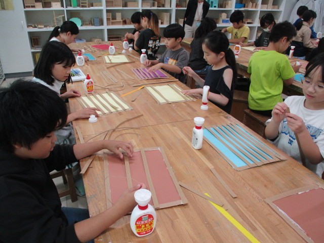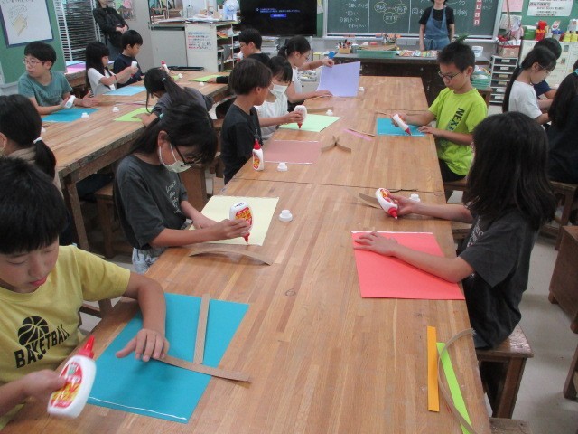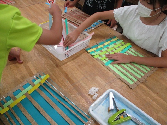 色が織りなすハーモニー~4年 公開日 2025/10/07 更新日 2025/10/07 今日のできごと 図工の制作の学習です。自分の作品を展示するマットを、紙バンド、紙テープなどを用いて、色や構成の工夫をしながら作っていました~