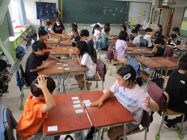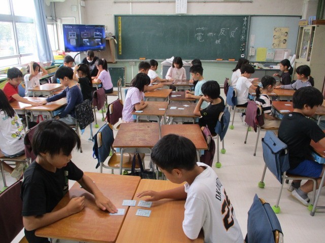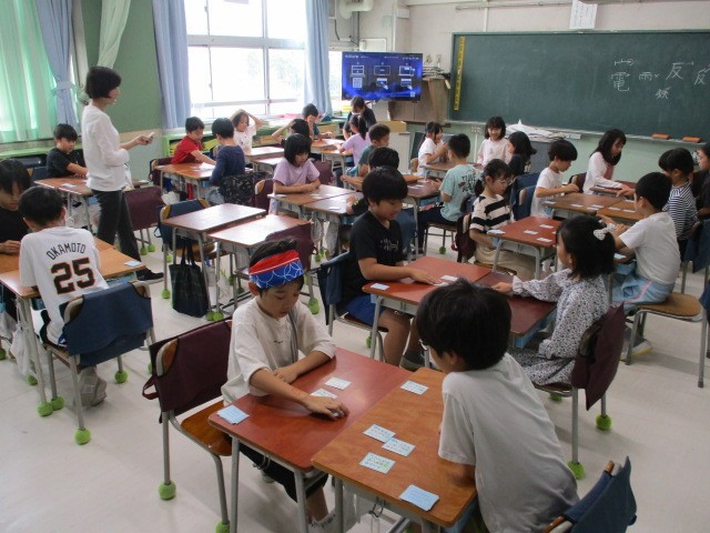 百人一首に挑戦~3年 公開日 2025/10/09 更新日 2025/10/09 今日のできごと 教科「日本語」では、俳句や和歌(短歌)、漢詩、明治以降における詩を読み、何度も朗誦することを通して、日本語の響きやリズムを楽しむ活動をします。和歌(短歌)で構成された百人一首を、カルタを使って親しむため、かるたとりに挑戦していました~