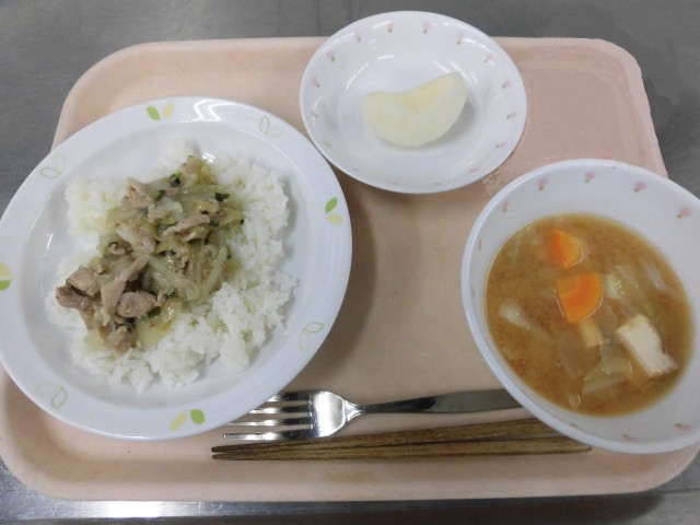 ねぎ塩豚丼 キャベツのみそ汁 梨 牛乳