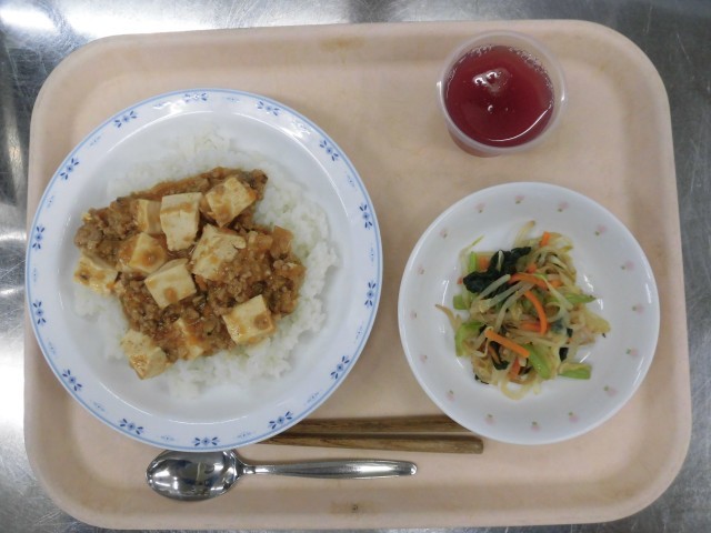 麻婆豆腐丼 小松菜のあえもの ぶどうゼリー 牛乳
