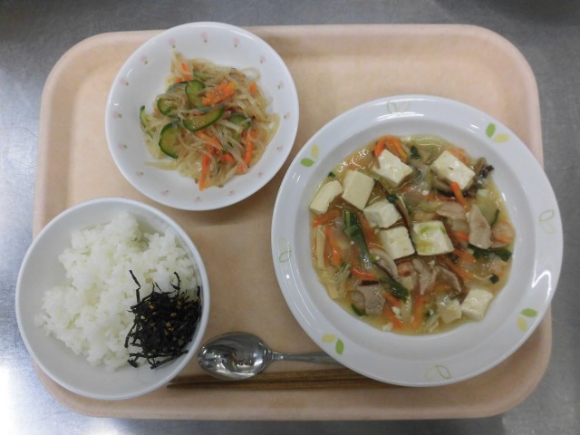 ごはん 韓国風ふりかけ 豆腐とえびの旨煮 春雨サラダ 牛乳
