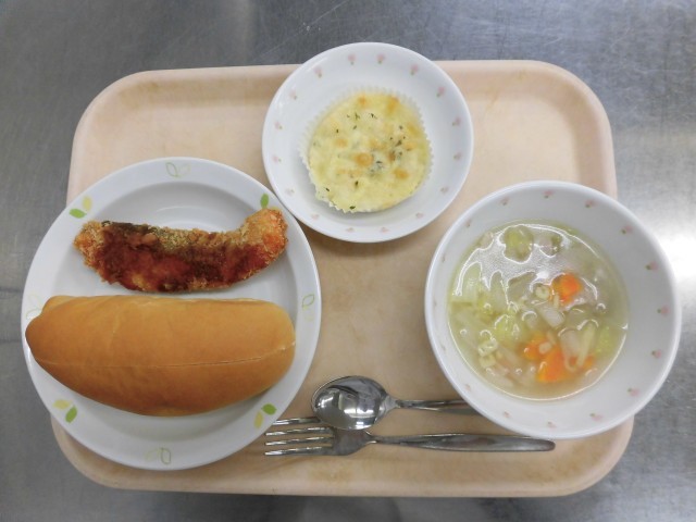 コッペパン 鮭フライ じゃがいものチーズ焼き アルファベットマカロニスープ 牛乳