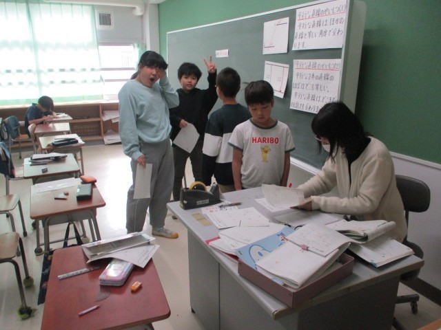 垂直と平行~4年 公開日 2025/11/19 更新日 2025/11/19 今日のできごと 算数の習熟度別学習です~4年生も既習事項を活用して問題に挑戦~その場で確認して、学習事項をしっかり身に付けていました~