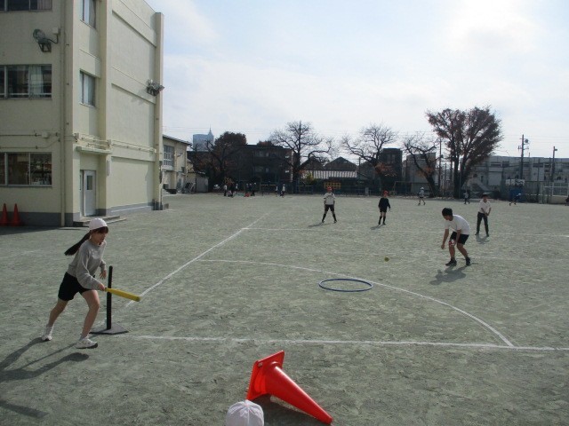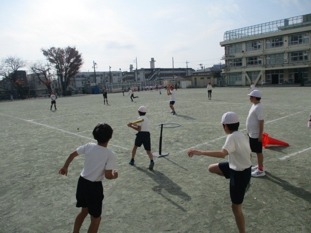 ティーボール~6年 公開日 2025/12/02 更新日 2025/12/02 今日のできごと 高学年のベースボール型の「ボール運動」、ティーボールの学習です。ボールを打つ攻撃と隊形をとった守備による簡易化されたゲームに挑戦です~ルールを工夫したり、チームの特徴に応じた作戦を選んだりすることも大事な学習です~