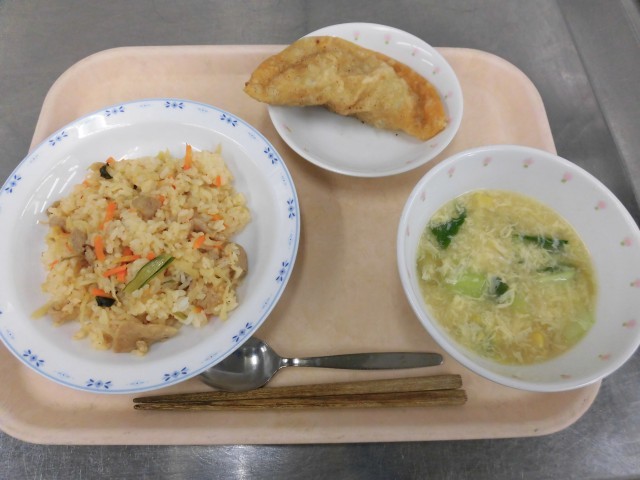 キムタクチャーハン ジャンボ揚げぎょうざ 青菜とコーンの卵スープ 牛乳
