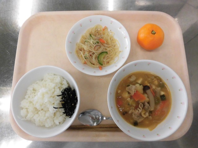 ごはん 韓国風ふりかけ チゲ豆腐 春雨サラダ みかん 牛乳