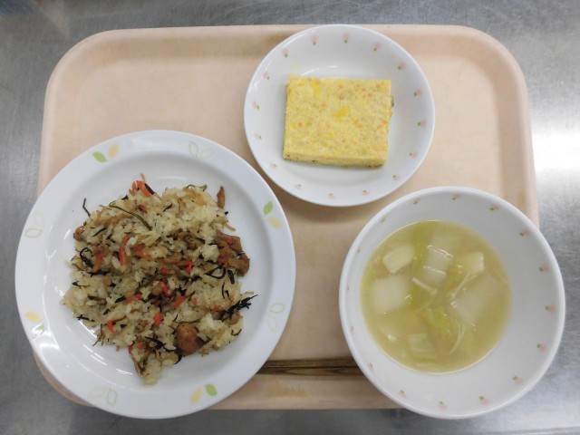 磯おこわ 五目卵焼き たらと白菜のみそ汁 牛乳