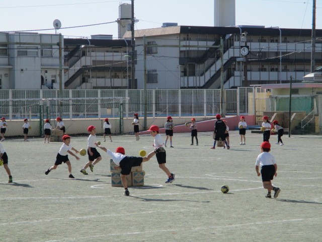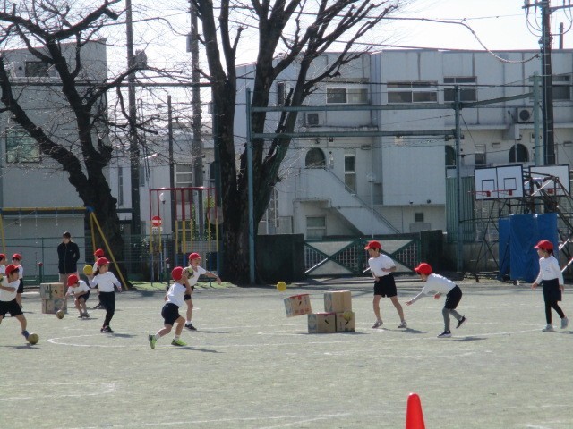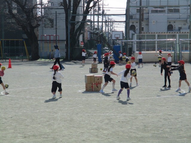ボール投げゲーム~1年 公開日 2025/12/23 更新日 2025/12/23 今日のできごと 低学年のゲームの学習です~低学年のボールゲームでは、簡単なボール操作と攻めや守りの動きによって易しいゲームを行います~