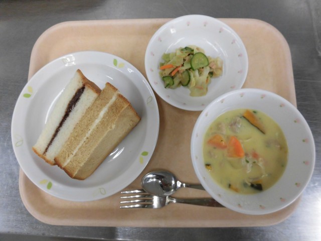 二色サンド パンプキンシチュー ツナサラダ 牛乳