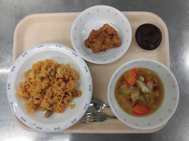 ケチャップライス フライドチキン 白いんげん豆のスープ 豆腐ショコラケーキ 牛乳