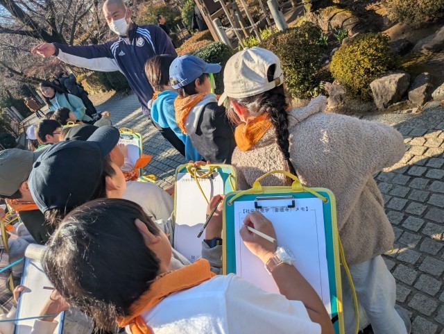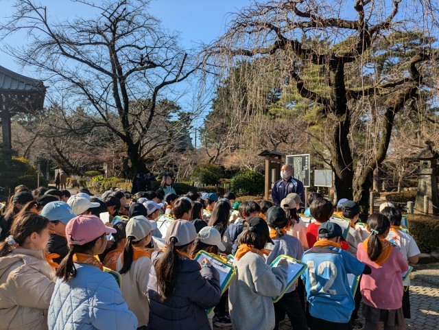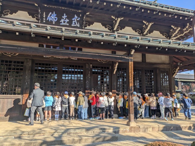 住職の方に、豪徳寺の説明を伺っています。探検ボードに挟んだワークシートに一生懸命記入しています。「仏殿」「お釈迦様」「本堂」等難しい言葉もありますが、頑張って聴いています。
