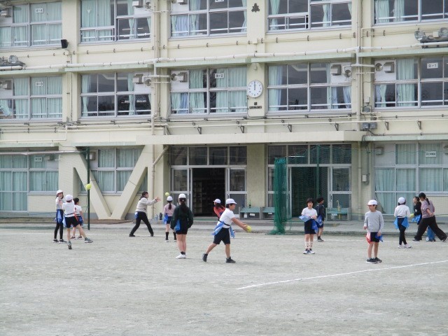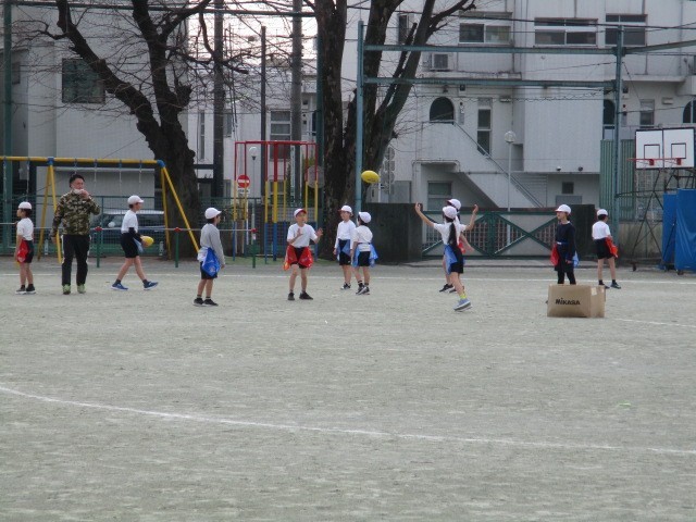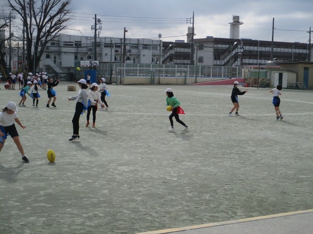 ゴール型ゲーム~4年 公開日 2026/01/19 更新日 2026/01/19 今日のできごと 4年生のゴール型ゲームの学習です。タグラグビーを基にした易しいゲームに向けて、基本的なボール操作とボールをもたないときの動きについての学習が進んでいました~