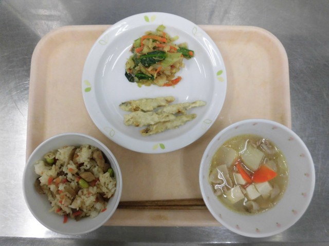とりめし わかさぎの天ぷら 野菜のごまだれかけ 豚汁 牛乳