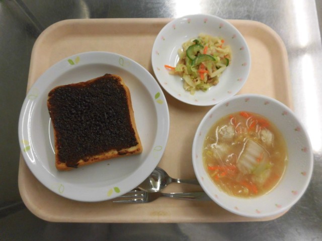 ごまココアトースト ツナサラダ 白菜と肉団子のスープ 牛乳
