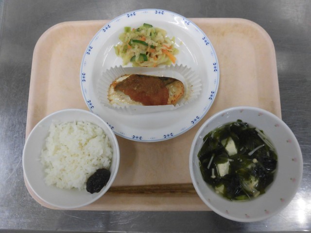 ごはん のりの佃煮 さばのおろしポン酢かけ みそドレッシングサラダ 豆腐とわかめのすまし汁 牛乳