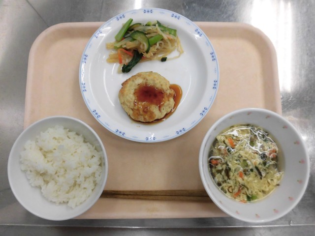 ごはん たらのハンバーグ 糸寒天と野菜のあえもの めかたま汁 牛乳